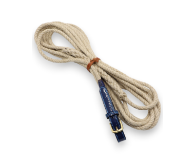 Ramal de cañamo para presentación de caballos de 6 metros de longitud con portamozo cosido en cuero y hebillaje en latón.