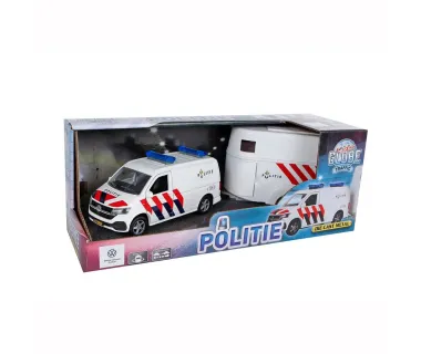 Juguete: Coche de policía Volkswagen con remolque para caballos. Coche con acción de retroceso. Las puertas laterales se pueden abrir.